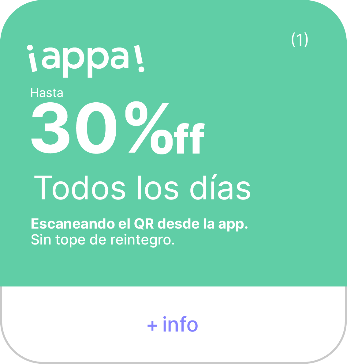 (1) PROMOCIÓN VÁLIDA EN LOS STANDS ADHERIDOS DE RE! OUTLET (AV. SARMIENTO 2704, CABA) DEL 17/10/2025 AL 30/10/2025. TODOS LOS CLIENTES QUE TENGAN DESCARGADA LA APLICACIÓN APPA EN SUS DISPOSITIVOS MÓVILES Y ESCANEEN EL CÓDIGO QR DEL STAND ADHERIDO PODRÁN ACCEDER A DESCUENTOS DE HASTA UN 30% SOBRE EL MONTO TOTAL DE LA FACTURA, SEGÚN SE INDIQUE EN CADA STAND. CONSULTE EN CADA LOCAL/STAND ADHERIDO EL BENEFICIO AL QUE SE ENCUENTRA ADHERIDO O CONSÚLTELOS EN HTTPS://WWW.REOUTLET.COM.AR/. EL DESCUENTO APLICARÁ EN LÍNEA DE CAJA. DESCUENTOS VÁLIDOS CON TODOS LOS MEDIOS DE PAGO CON LOS QUE HABITUALMENTE OPERA CADA LOCAL/STAND ADHERIDO. NO ACUMULABLE CON OTRAS PROMOCIONES Y/O DESCUENTOS VIGENTES. IRSA INVERSIONES Y REPRESENTACIONES SOCIEDAD ANONIMA, CUIT N° 30-52532274-9, CARLOS DELLA PAOLERA 261, PISO 9°, C.A.B.A.