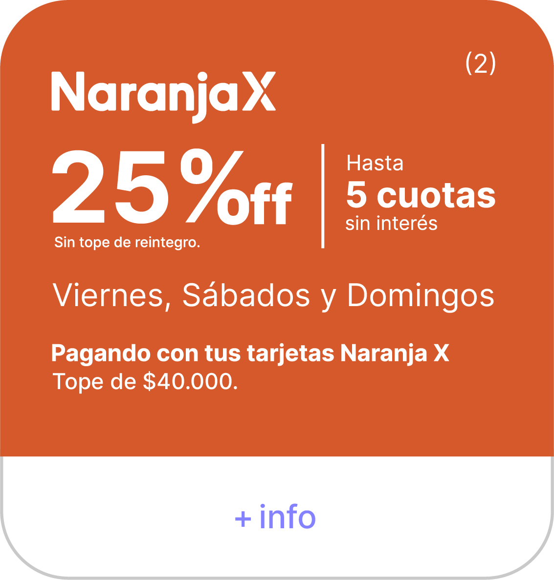 (2) Beneficio válido para titulares y adicionales de la tarjeta de crédito Naranja X!, los días viernes, sábado y domingo entre el 17 hasta el 30 de octubre de 2025 en los comercios adheridos de la feria Re! Outlet (Av. Sarmiento 2704, CABA). Los clientes que abonen sus compras con la tarjeta de crédito Naranja X! obtendrán un 25% de ahorro, con tope de $40.000 por cliente durante toda la promoción, y podrán abonar su consumo 5 cuotas sin interés bajo Plan 5 Cero. El ahorro se realizará vía reintegro. El reintegro se verá reflejado en el resumen de cuenta hasta 90 días posterior a realizada la transacción. No aplicable a compras realizadas con la tarjeta de crédito Naranja X Visa, Mastercard o American Express ni para transacciones realizadas mediante agrupadores y/o billeteras virtuales. No acumulable con otras promociones. En caso de fuerza mayor y/o caso fortuito que genere alguna imposibilidad para llevar a cabo el beneficio o para continuar con el mismo, Naranja X podrá suspender definitivamente o transitoriamente el beneficio, como así también introducir las modificaciones pertinentes. Tarjeta Naranja S.A.U., CUIT 30-68537634-9, La Tablada 451, ciudad de Córdoba. Más información en https://www.naranjax.com/promociones/.